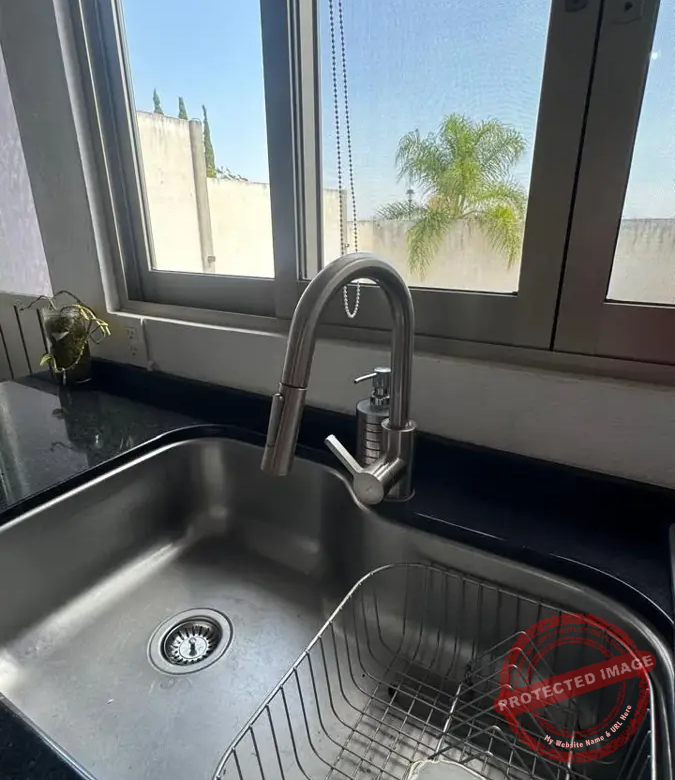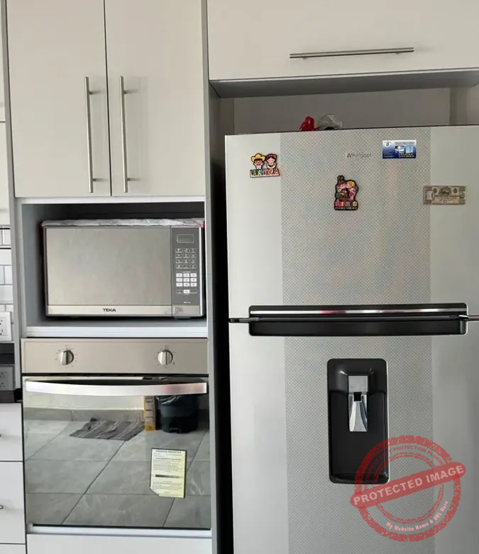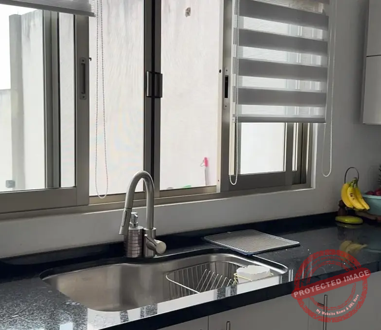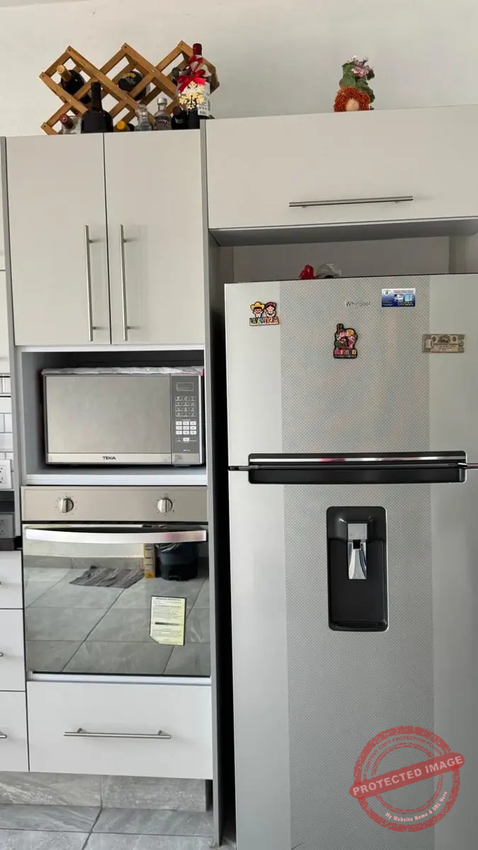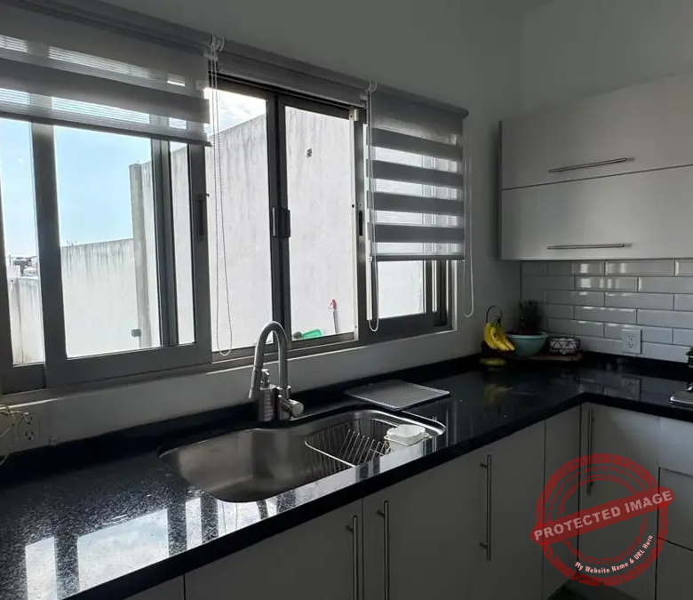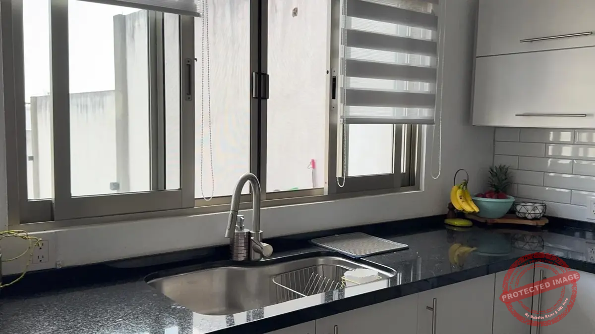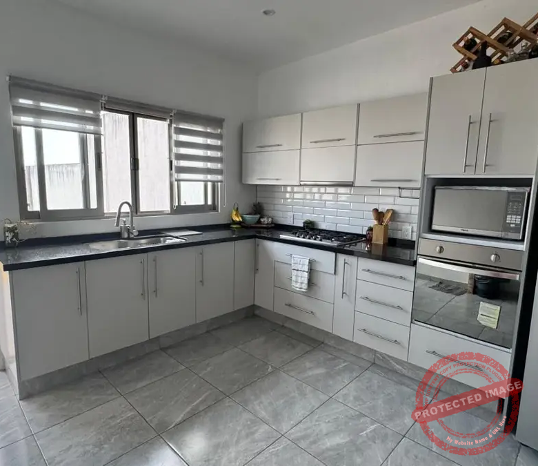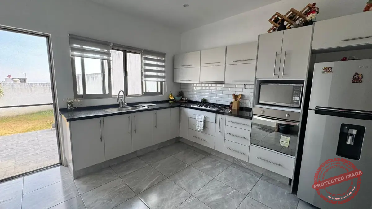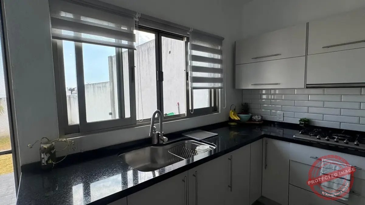 – Área de Comedor con cocina de concepto abierto con encimera de granito con parrilla a gas de 5 quemadores, horno, area definida para horno de microondas y refrigerador. Grandes y comodos espacios para guardado, doble tarja con llave monomando y alacena.